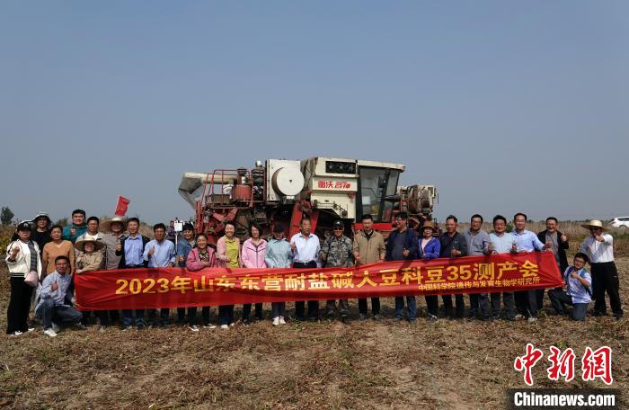 10月8日,中国科学院遗传与发育生物学研究所(遗传发育所)科研团队选育的耐盐高产大豆新品系“科豆35”,在山东省东营市黄河入海口一处盐碱地试验田里进行实收测产,结果显示,“科豆35”大面积示范种植亩产稳定达270公斤以上,最高突破300公斤达306.52公斤。图为测产专家代表和科研团队合影。中新网记者 孙自法 摄