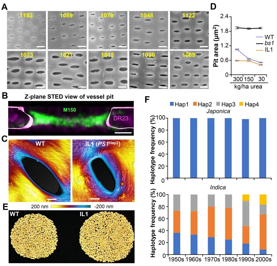 图1:水稻木质部导管纹孔尺寸控制QTL基因PS1作用机制解析