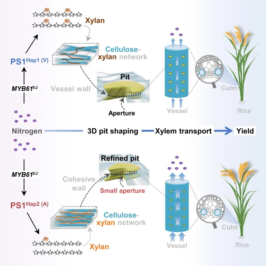 氮素是经木质部导管转运的重要营养元素。为明确PS1介导的纹孔塑形是否影响氮运输效率,开展了氮转运及差别施氮田间测试,发现携带PS1Hap2的水稻氮素运输效率明显提高,并在高低氮下均可提高产量,且低氮下尤为明显,表明PS1Hap2为优异单倍型。单倍型分析则发现PS1存在籼粳分化,粳稻几乎均为PS1Hap1单倍型,而籼稻为另外三种单倍型,但均包含酶活性增强的关键变异。对近70年育成的水稻品种进行单倍型分析发现,优异单倍型PS1Hap2在籼型中应用比例越来越高,而在粳稻育种中却极少被使用。将PS1Hap2导入粳稻武育粳3号和武密粳,均可明显提高其小区产量,表明PS1Hap2具有重要育种应用潜力。研究还意外发现,PS1响应低氮,而且氮素通过PS1调控纹孔大小。而深入的遗传及分子生物学实验证实,氮利用效率QTL基因MYB61介导了PS1的氮响应。聚合两者优异等位可更加优化纹孔和蒸腾势,进一步提高稻谷产量。