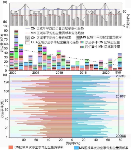 2000-2023年东亚中部地区中国北方与蒙古国大规模沙尘事件起尘量及贡献率变化。受访单位供图